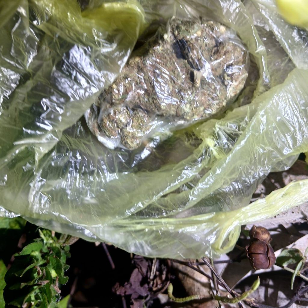 During the operation, an officer noticed a yellow plastic bag. Upon retrieving and examining the bag, authorities observed what appeared to be a quantity of green leafy substance suspected to be cannabis.