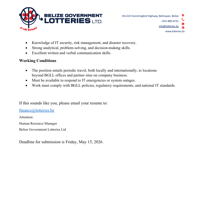 By Belize Live News Staff: Belize Government Lotteries Limited is recruiting an Information Technology Manager to lead its technology operations and strategy.